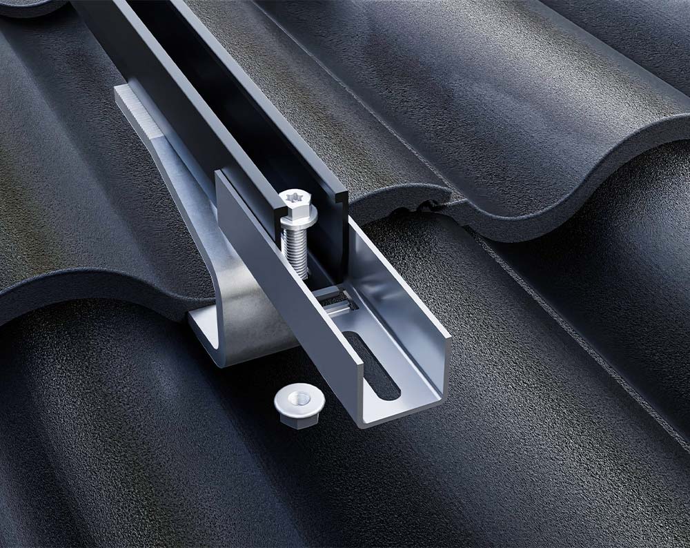 Le connecteur longitudinal pour le profilé de base de HSI sert à relier deux profilés de base LayTec. Le connecteur en forme de U est simplement posé sur les profilés par le bas et fixé à l'aide des vis et des écrous fournis. Grâce aux entretoises découpées, le connecteur est automatiquement centré entre les profilés et laisse un espace d'environ 7 mm entre les modules pour la dilatation thermique des profilés. Le connecteur sert uniquement à la connexion et ne remplace pas les points de fixation sur le toit.